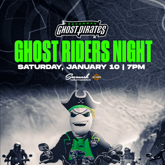 Saturday, January 10th is Ghost Rider Night at Enmarket Arena with the Savannah Ghost Pirates! Join us as we partner up for a fun filled night of Hockey and Harley! Tickets are available for a discounted price